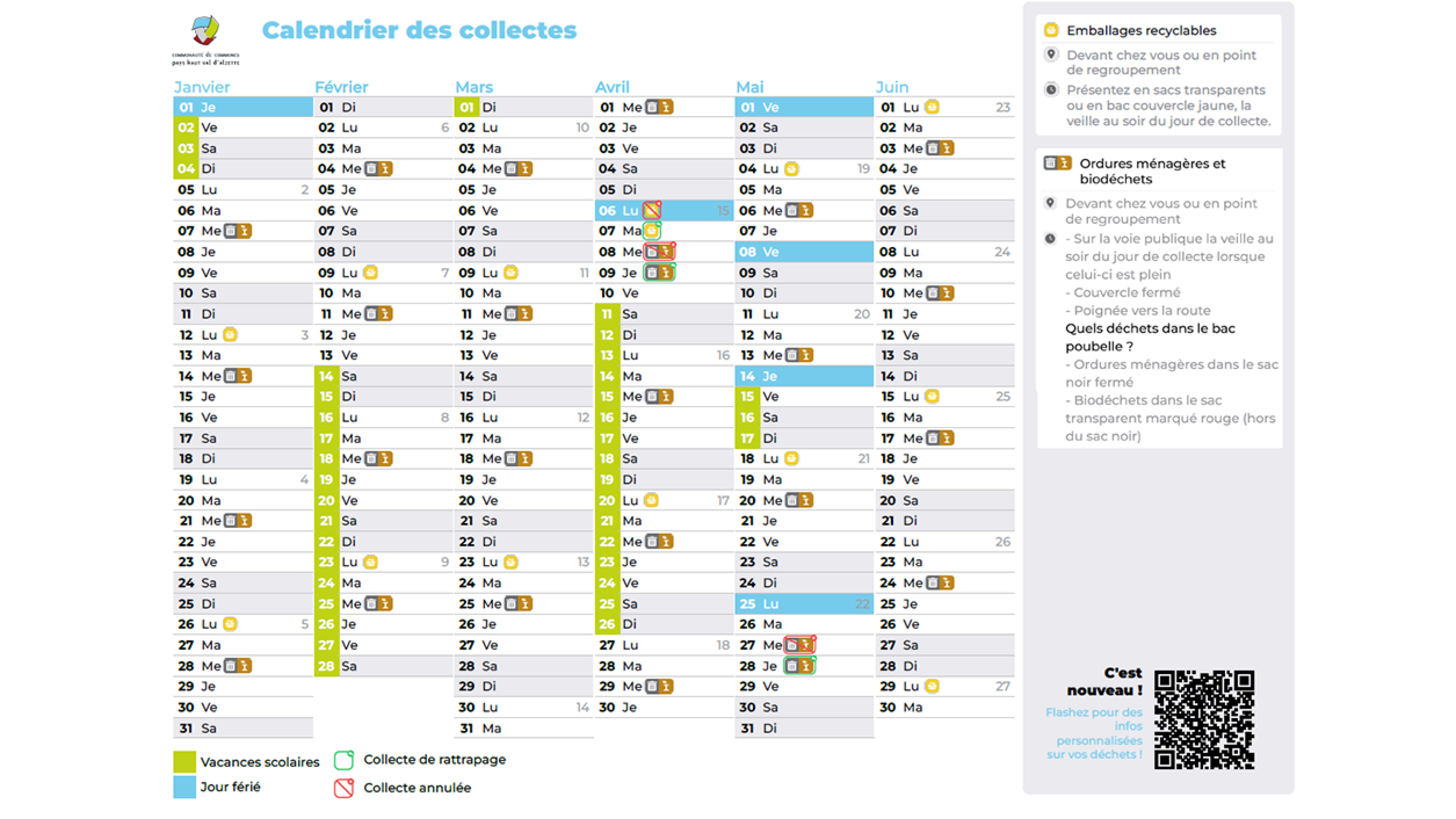 Le calendrier de collecte évolue ! À partir de cette année, la CCPHVA ne distribue plus de calendrier de collecte en version papier. Cette décision vise à réduire le gaspillage de papier, maîtriser les coûts et limiter notre impact sur l’environnement.