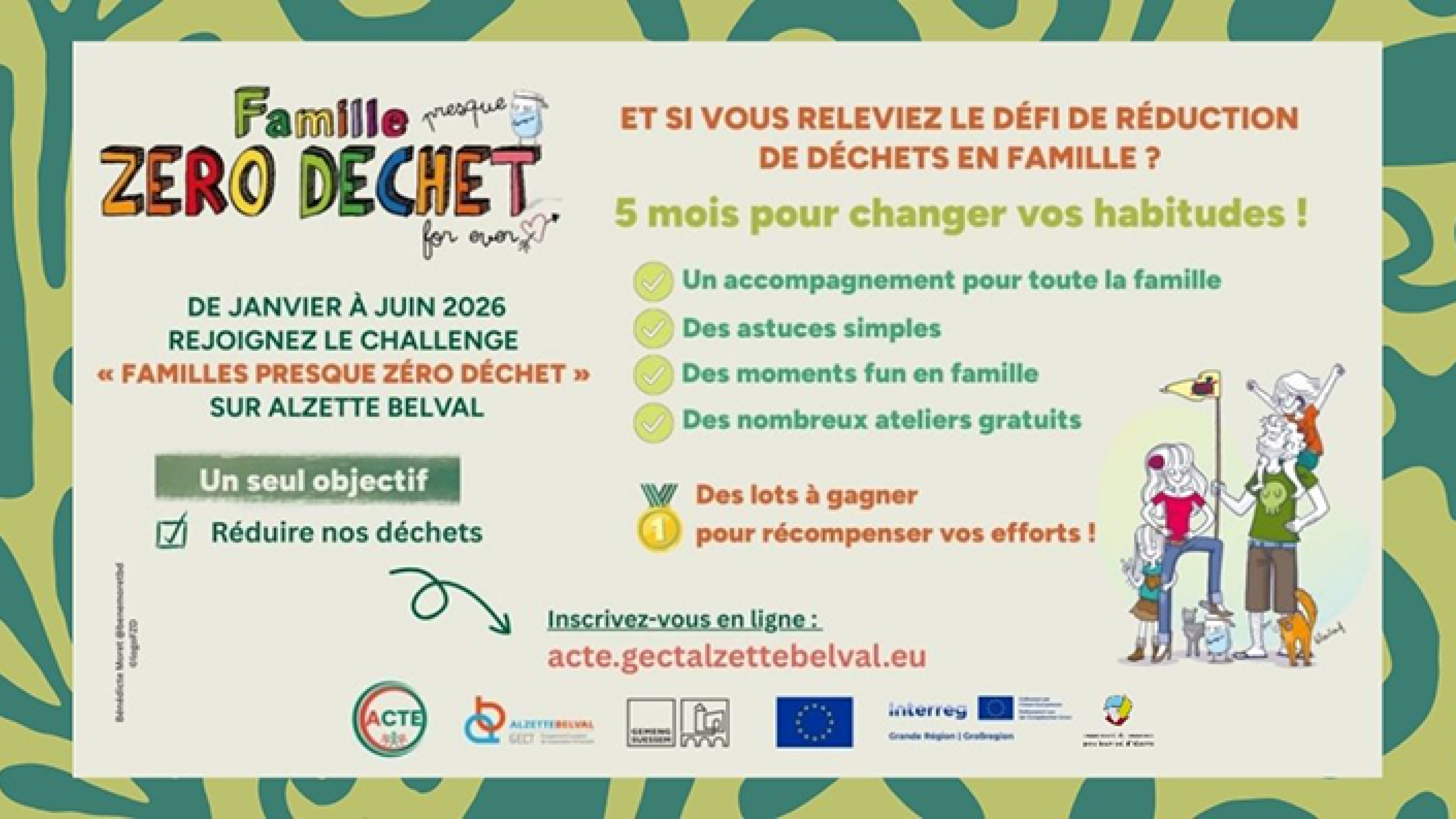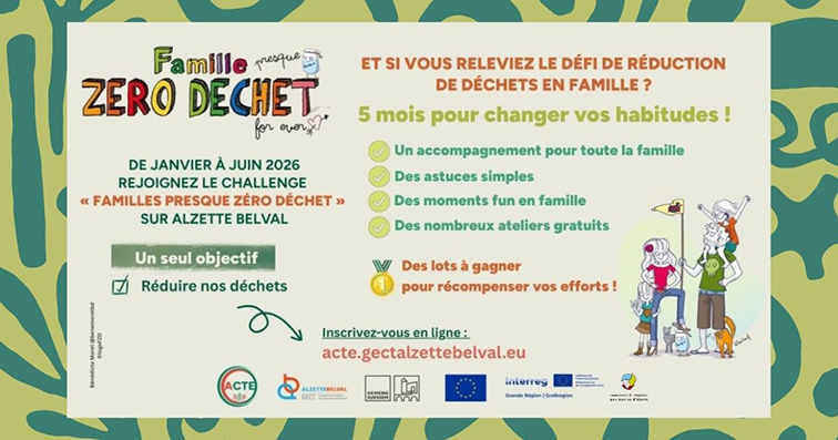 Démarrez l'année sur une note positive et engagée, participez au challenge "Famille Presque Zéro Déchet" organisé par le GECT Alzette Belval et la commune de Sanem (Luxembourg).