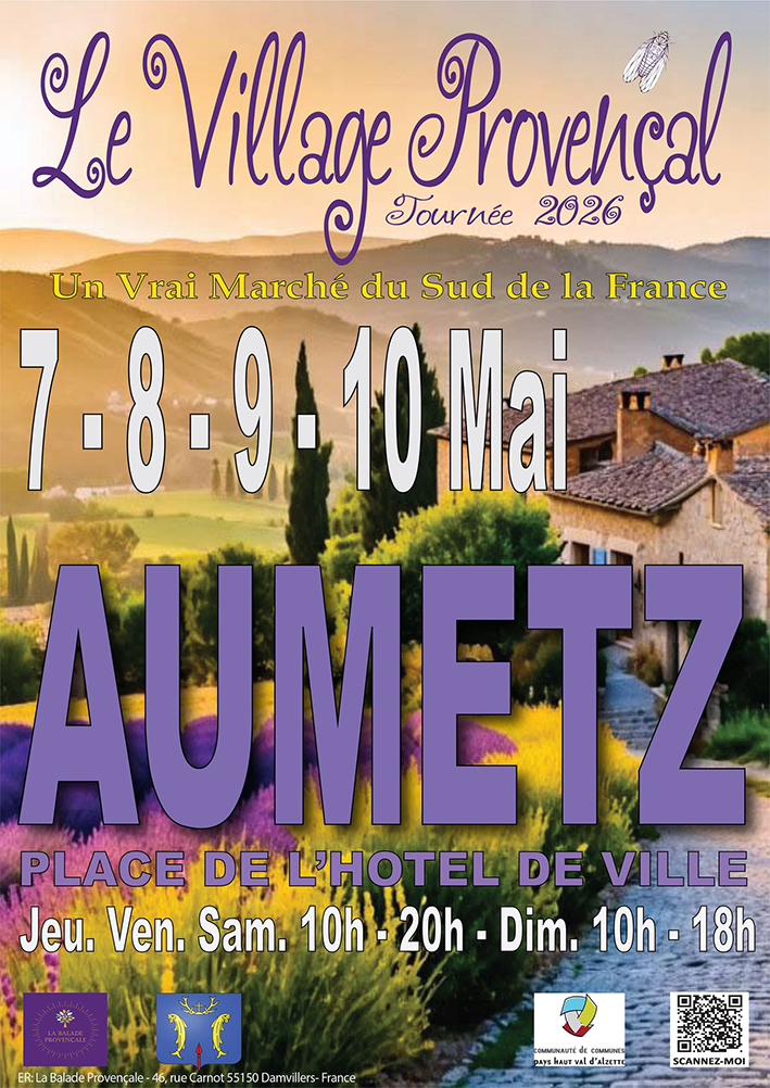 À l’initiative de la Communauté de Communes Pays Haut Val d’Alzette, et en partenariat avec la commune d'Aumetz, le « Village Provençal », authentique marché du Sud de la France, revient sur notre territoire pour vous offrir un avant-goût de vacances à base d'accent chantant, de couleurs, d'odeurs, d'artisanat et de culture provençale.