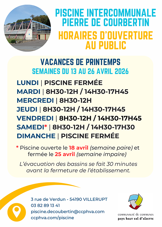 MAJ au 09.04.2026 : retrouvez ci-dessous les horaires d'ouverture au public de la piscine pendant les vacances de printemps (du 13 au 26 avril 2026).